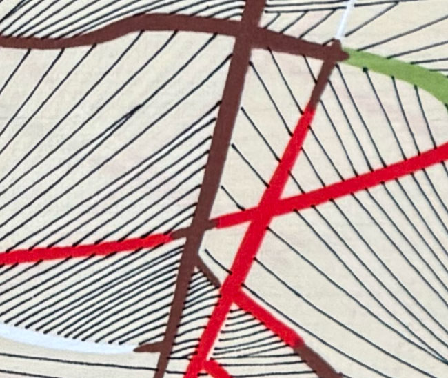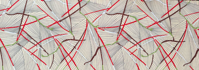 Striking smooth cream wool with dyed abstract design. Note that this bolt is in two pieces, each 4.5 yards in length.