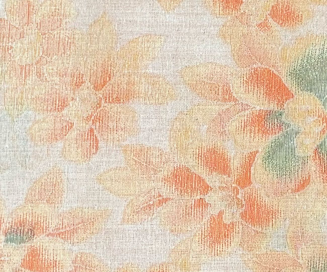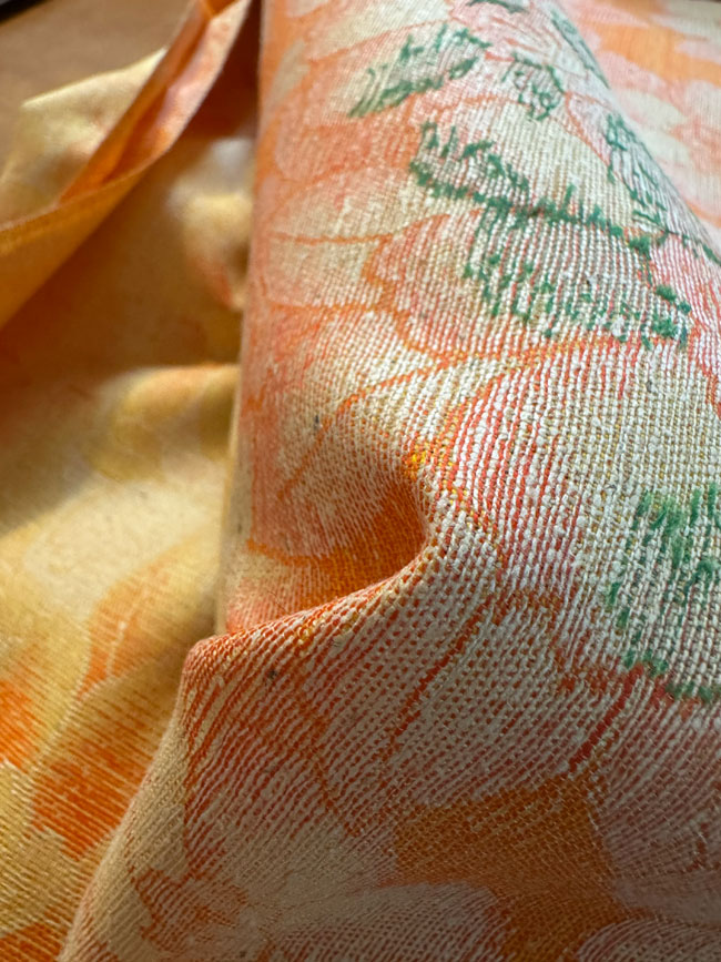 Gorgeous deep apricot coloured wool with woven flowers. The green leaves have been individually woven.