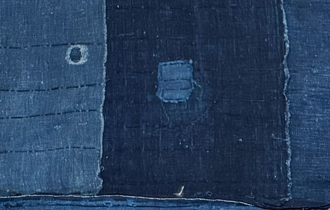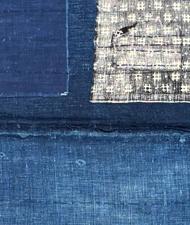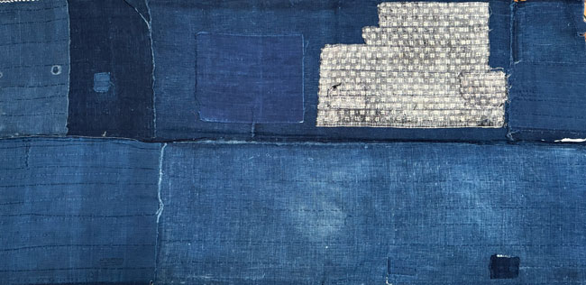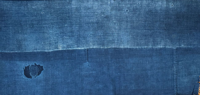 Vintage cotton boro piece with old woven Japanese mostly indigo cottons with a large patch of woven cotton. Some tears, wears and patches as shown, but an interesting, genuine and unique historical piece. The last image shows the reverse of the entire piece.