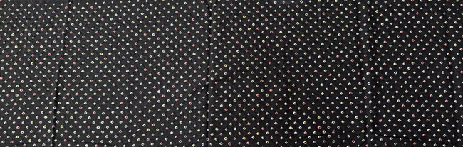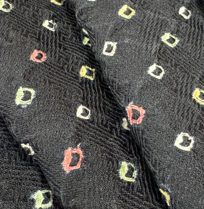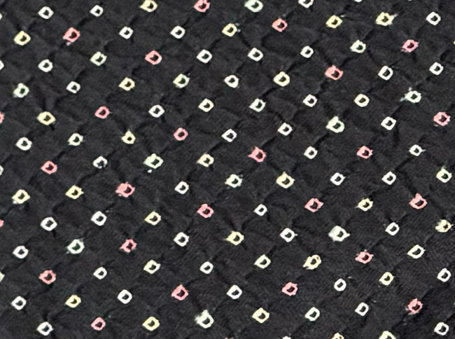 Black kimono silk with woven geometric design and dyed shibori dots in pink, apricot and white