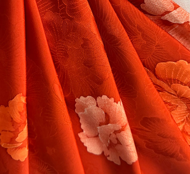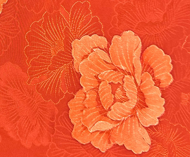 Beautiful rich orange silk with large woven and dyed flowers. Great drape.