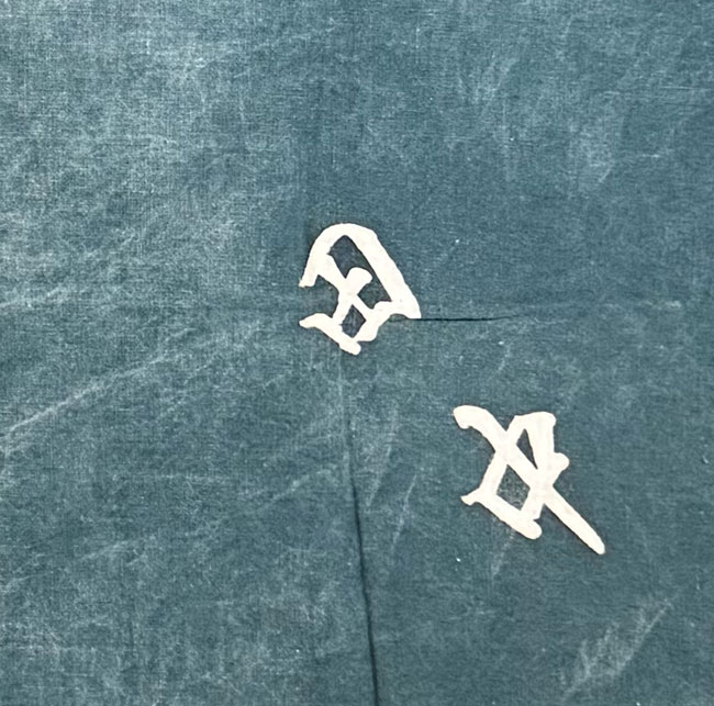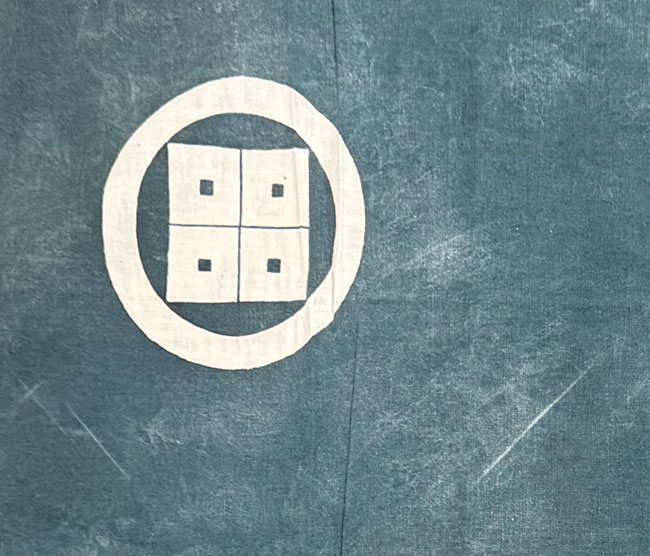 This vintage furoshiki is made from indigo dyed cotton and is also dyed with family mon. There is a hand stitched seam along the centre.
