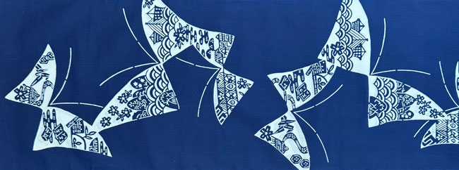 Royal blue cotton yukata with stylised butterfly design.