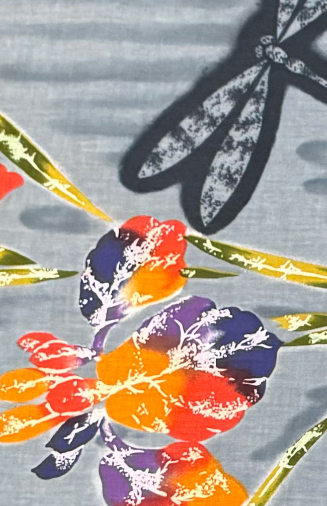 Grey cotton yukata with dyed floral and butterfly design.