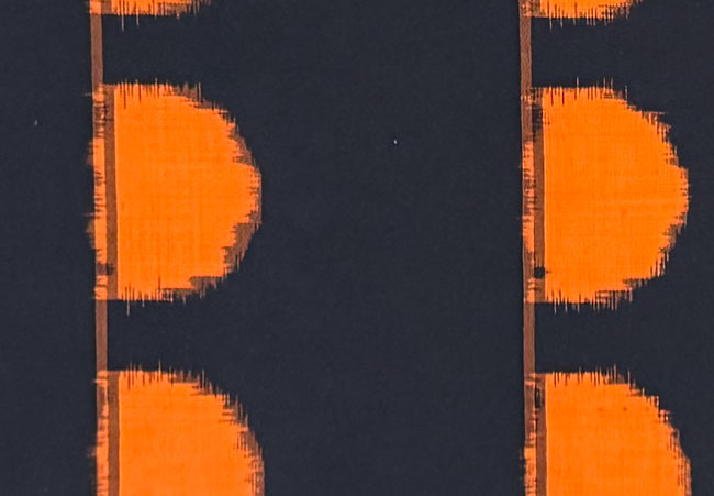 Fine black 100% wool with woven bright orange semi circles. Fully reversible ikat. .