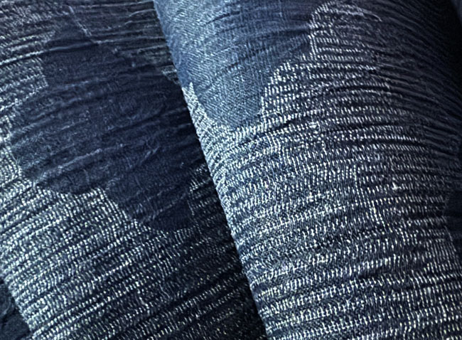 50%silk and %50 polyester light weight translucent kimono fabric. Holda it'f form and has a woven cloud design in blues. Fully reversible ikat fabric.