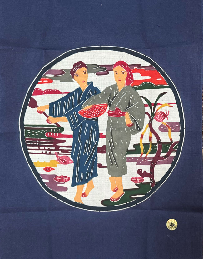 Cotton-linen blue piece with stenciled design of women in a field. ould make an attractive wall hanging or runner.