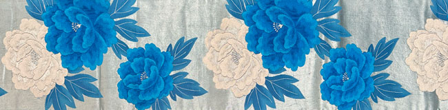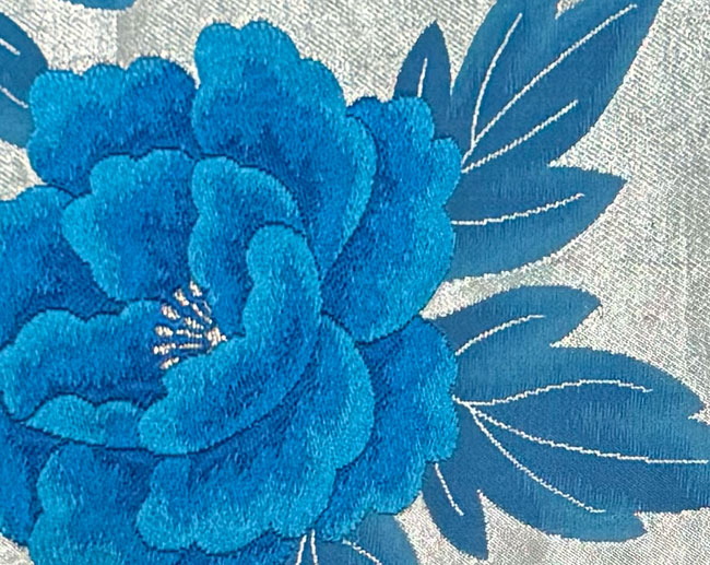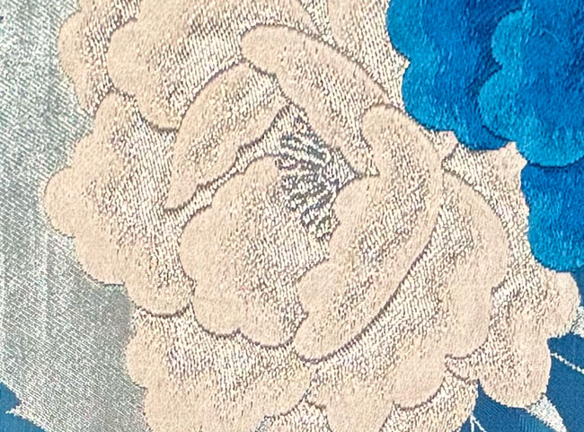Interesting silver-blue metallic silk background with large woven floral design with lots of metallic silver highlights. Typically, about 70% of the front is patterned and the remainder consists of blue silk. The reverse is a plain blue silk. It would look terrific as a wall hanging, a table runner or across the end of a bed. This obi does not have a stiff inner core.