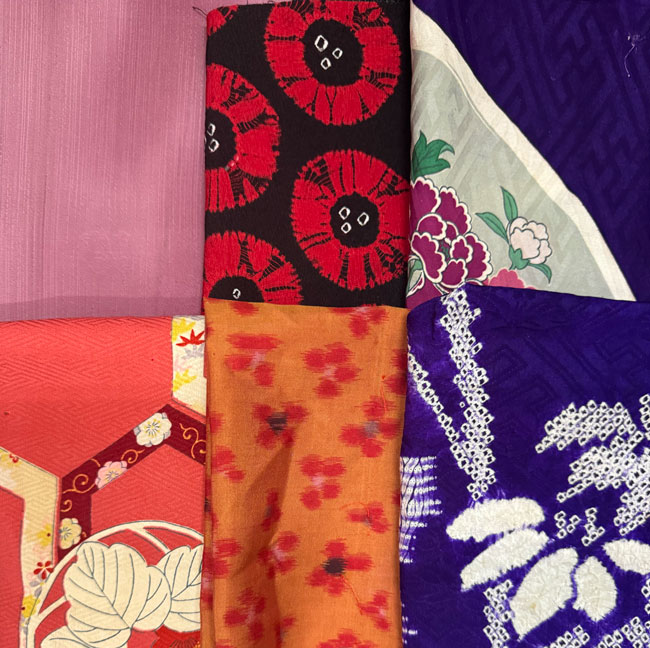 6 pieces of vintage Japanese kimono silk, all different and measuring approximately 12 x 14 inches or the equivalent.