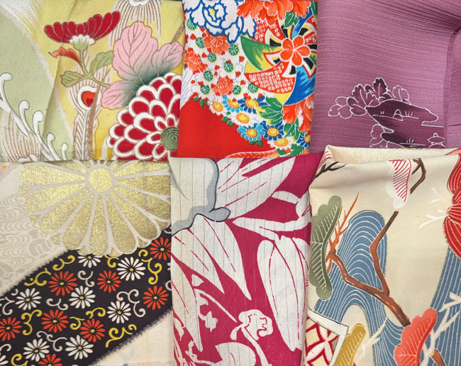 6 pieces of vintage Japanese kimono silk, all different and measuring approximately 12 x 14 inches or the equivalent.