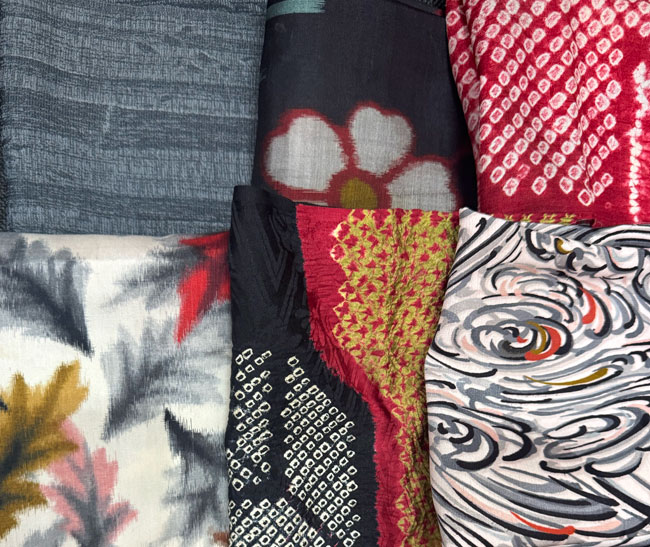 6 pieces of vintage Japanese kimono silk, all different and measuring approximately 12 x 14 inches or the equivalent.
