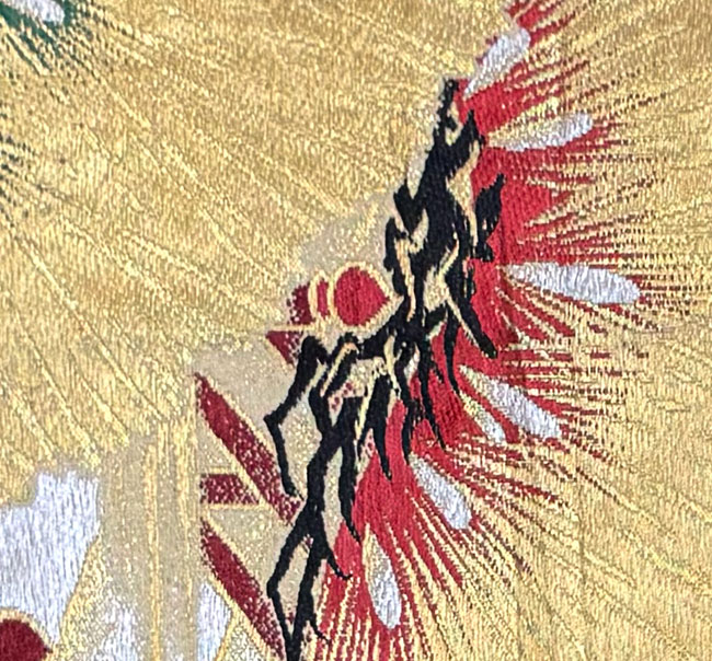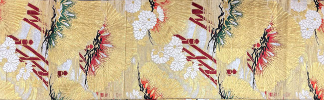 Dramatic vintage silk obi with lots of traditional woven pine trees and chrysanthemums mostly in metallic gold and other silk threads. This obi is in great condition. Wonderful obi for hanging, drape across a bed or to dress up a table. The front and reverse of this obi are of the same patterned fabric.