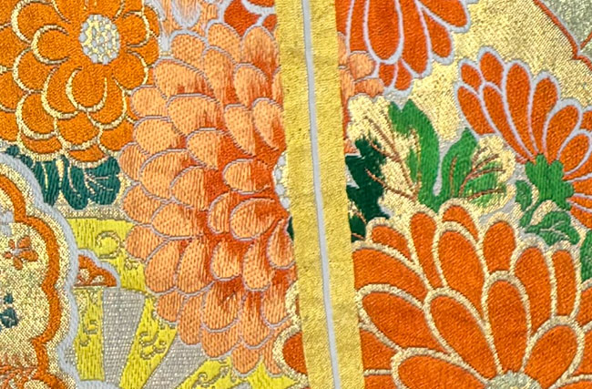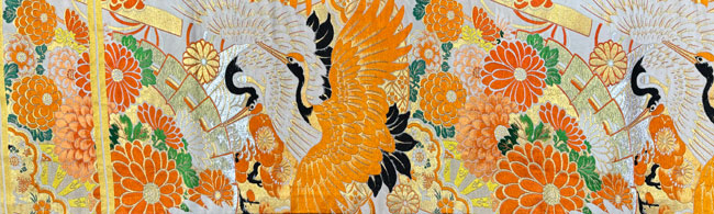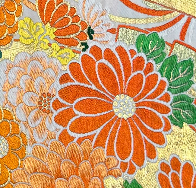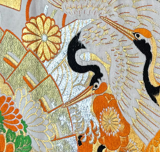Dramatic vintage silk obi with lots of traditional woven cranes and chrysanthemums mostly in metallic gold and other silk threads. This obi is in great condition. Wonderful obi for hanging, drape across a bed or to dress up a table. The front and reverse of this obi are of the same patterned fabric.