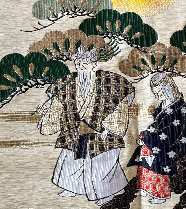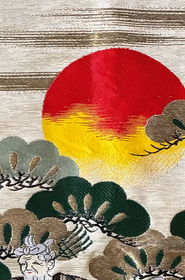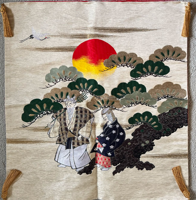 This is an unused large silk fukusa with a woven image of the Japanese characyers of Jo and Uba. It has a red silk backing with a family crest. It has four perfect gold tassels and would be impressive to hang or display.