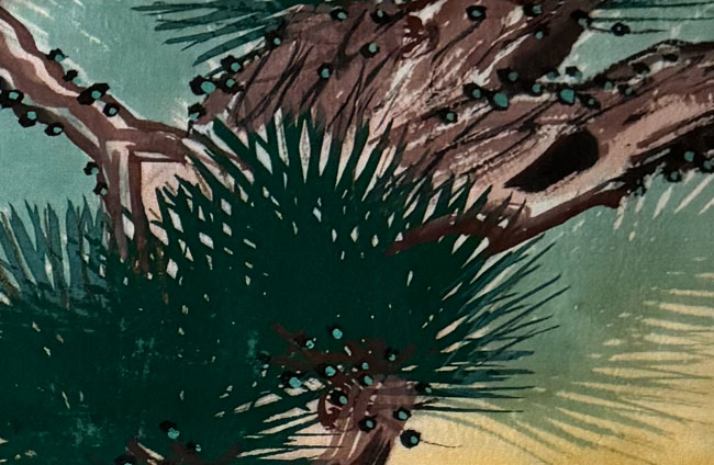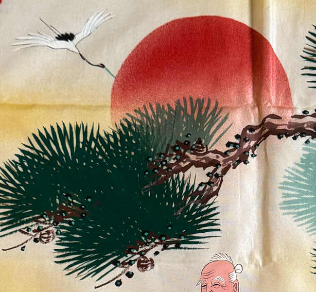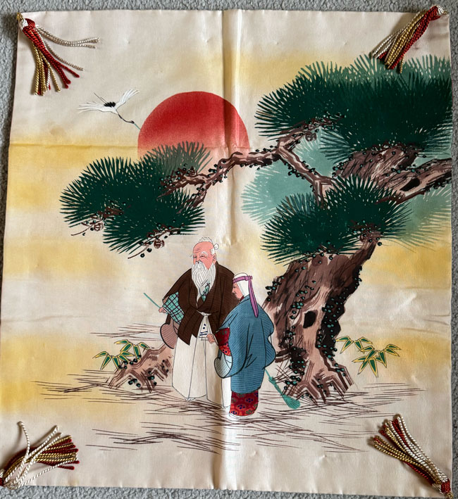 This is an unused soft silk fukusa with a hand painted image of the Japanese characters of Jo and Uba. It has a red silk backing. It has four perfect colourful tassels and would be impressive to hang or display.