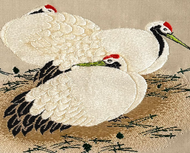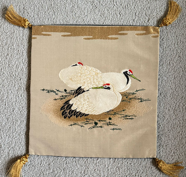 This is a small silk fukusa with a woven image of cranes. It has a blue silk backing with a woven gold mons.. It has four perfect gold tassels and would be impressive to hang or display.
