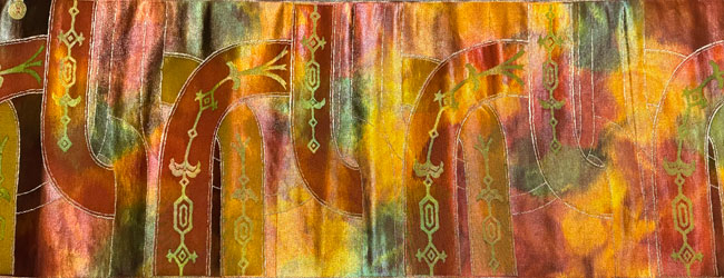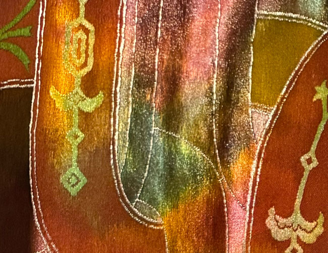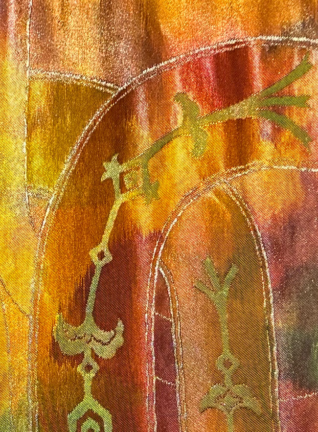This silk obi bolt is woven in beautiful metallic threads. 80 inches of the 180 inch length is patterned. The remainder and reverse is brown silk. It would look terrific as a wall hanging, a table runner or across the end of a bed. This obi does not have a stiff inner core.