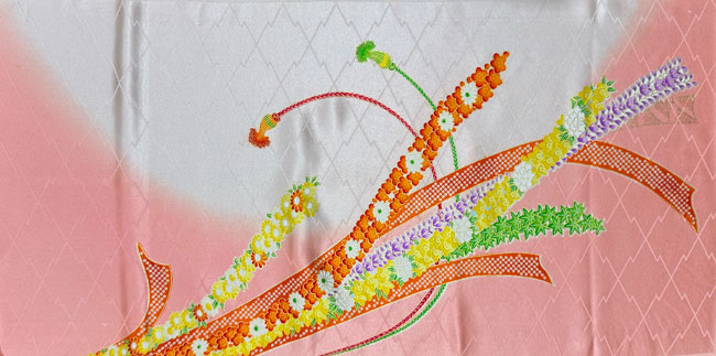 Pale pink silk with dyed colourful design over woven geometric design.