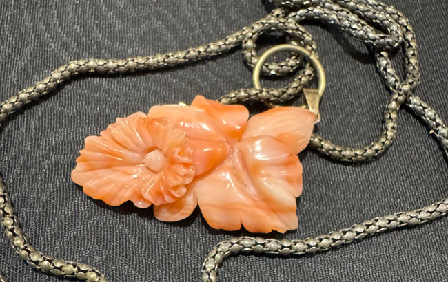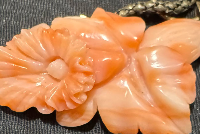 Pretty Japanese coral brooch in box. Comes with chain.Beautiful piece.