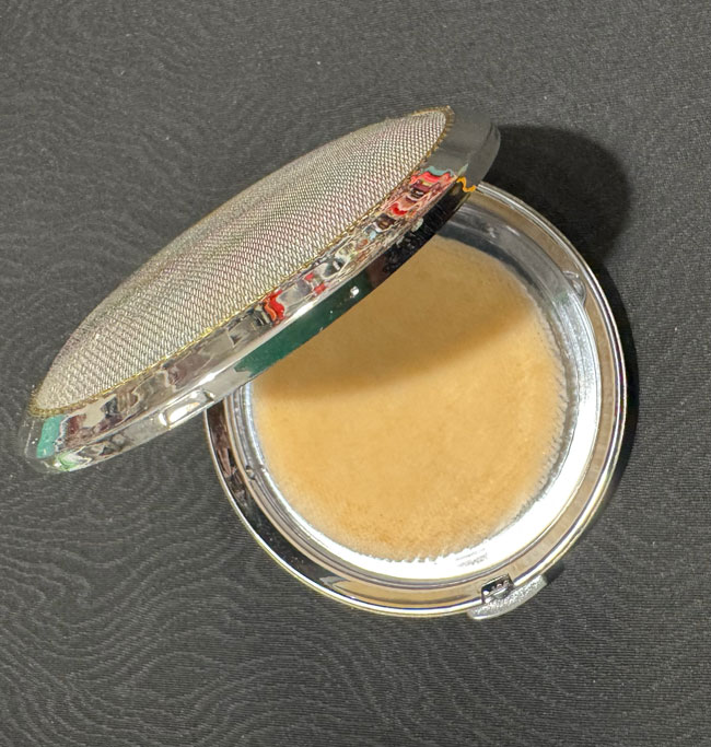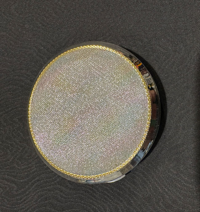 Silver tone metal compact with obi silk fabric feature.
