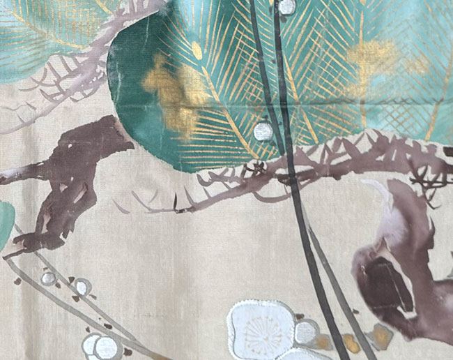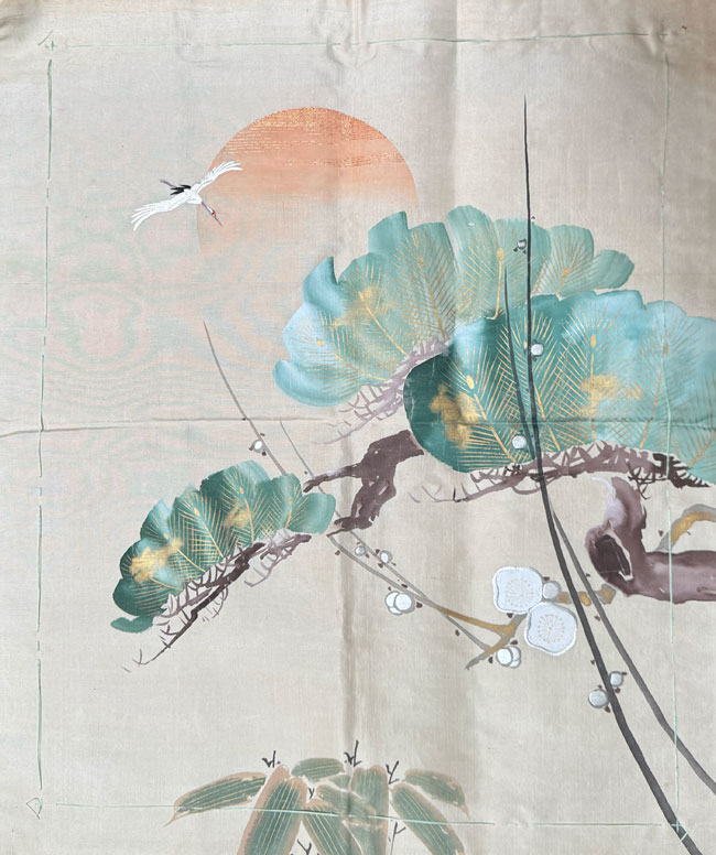 This cream silk vintage fukusa features hand painted pines and blossoms with some hand embroidery on the crane and blossom buds. It has an orange silk backing with woven cranes and some embroidery on the painted design. It would be impressive to hang or display.