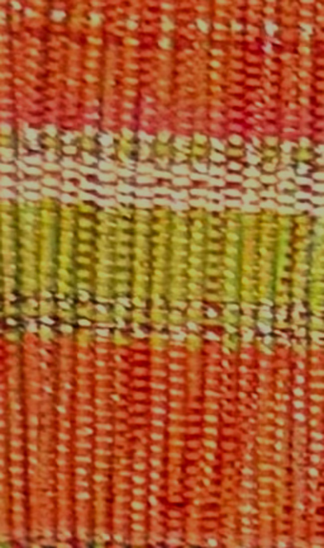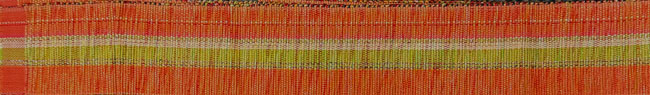 Orange coloured hand made sakiori obi with cream and green stripes and with metallic silver threads woven throughout. Woven vintage cotton with fine threads and finely rolled cotton fabric strips.