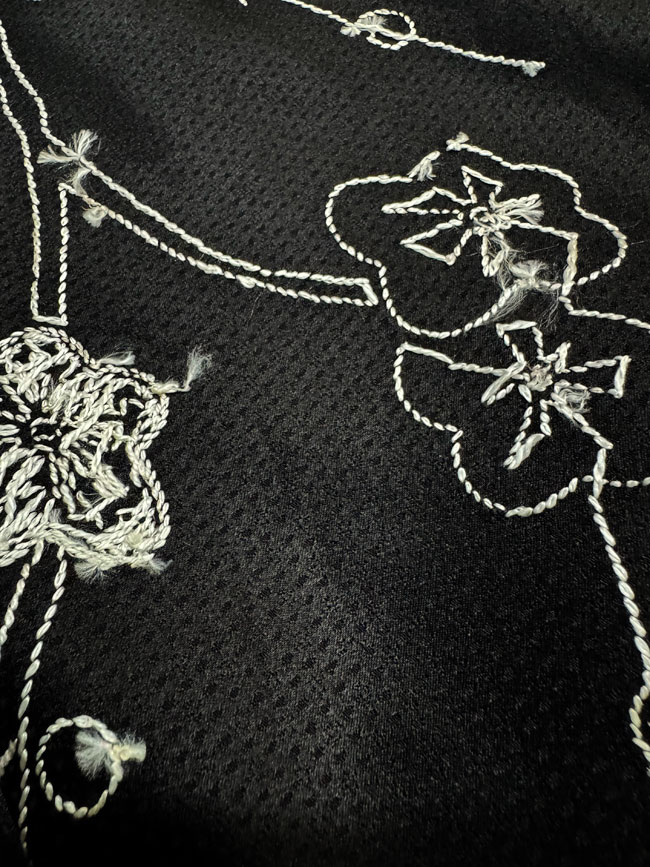 Soft black silk piece with hand embroidered design. Detailed image shows reverse.