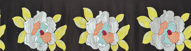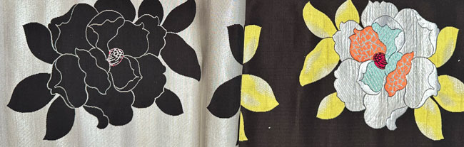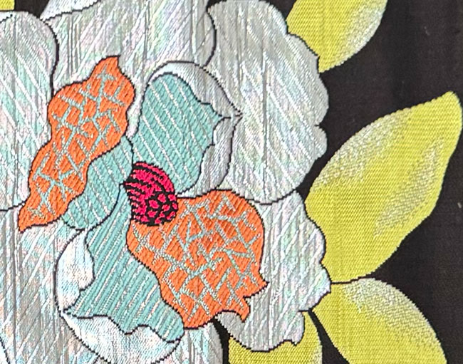 Black silk obi bolt with colourful silver and yellow large camellias. The reverse design can be seen in image 2. Both sides are fully patterned.