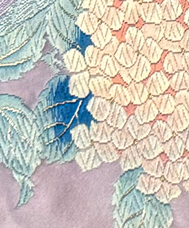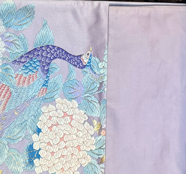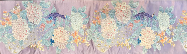 This silk obi is in a gorgeous lavender shade with woven peacocks and hydrangas. Typically, about 70% of the front is patterned and the remainder consists of lavender silk as seen in the last image. The reverse is also a lavender silk. It would look terrific as a wall hanging, a table runner or across the end of a bed. This obi does not have a stiff inner core.