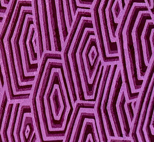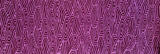 Quality synthetic kimono fabric with striking geometric pattern in purple tones over a finely all over woven abstract design..