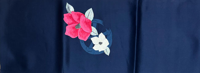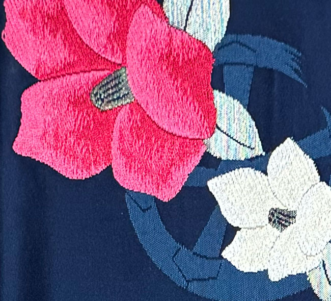Shiny dark blue synthetic with woven floral design.