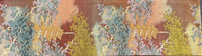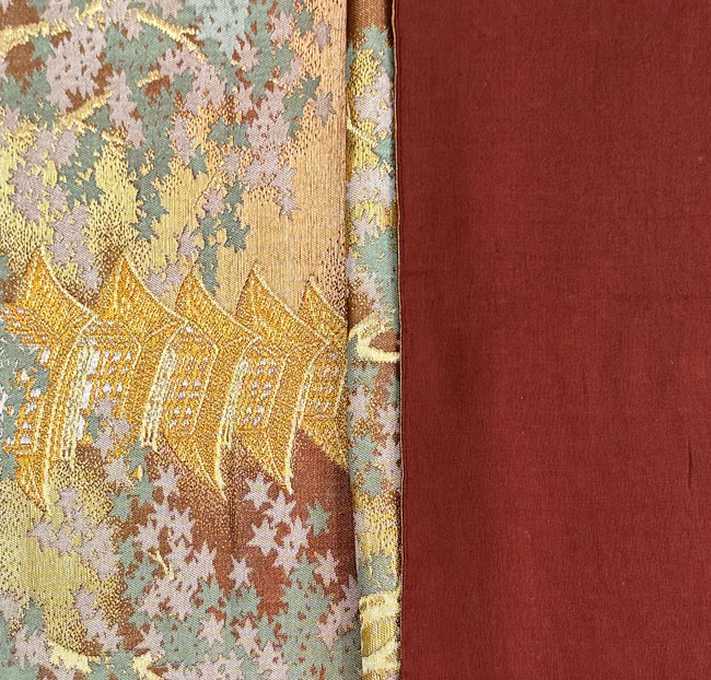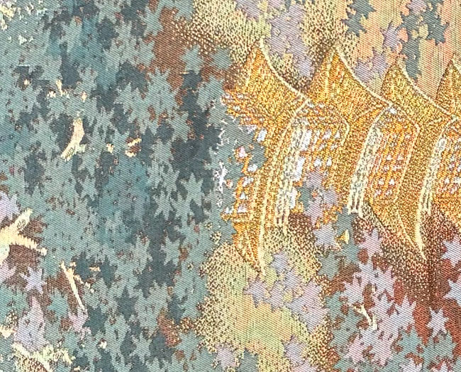 This is a beautiful vintage tan coloured silk obi. It features finely woven temples and maple leaves in gold and other silk threads. Typically, about 70% of the front is patterned and the remainder consists of tan silk as seen in the last image. The reverse is also a tan silk. It would look terrific as a wall hanging, a table runner or across the end of a bed. This obi does not have a stiff inner core.