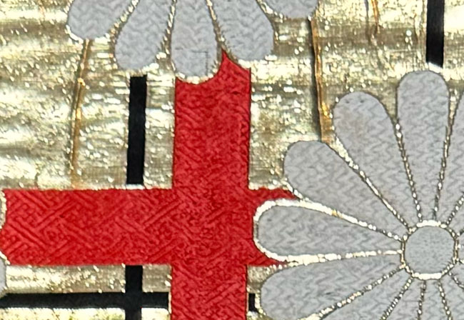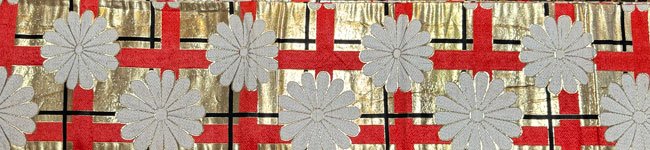 This is an ornate hanhaba narrow obi for informal wear or for a child's kimono. It is woven with metallic threads and other threads and is fully patterned on both sides.